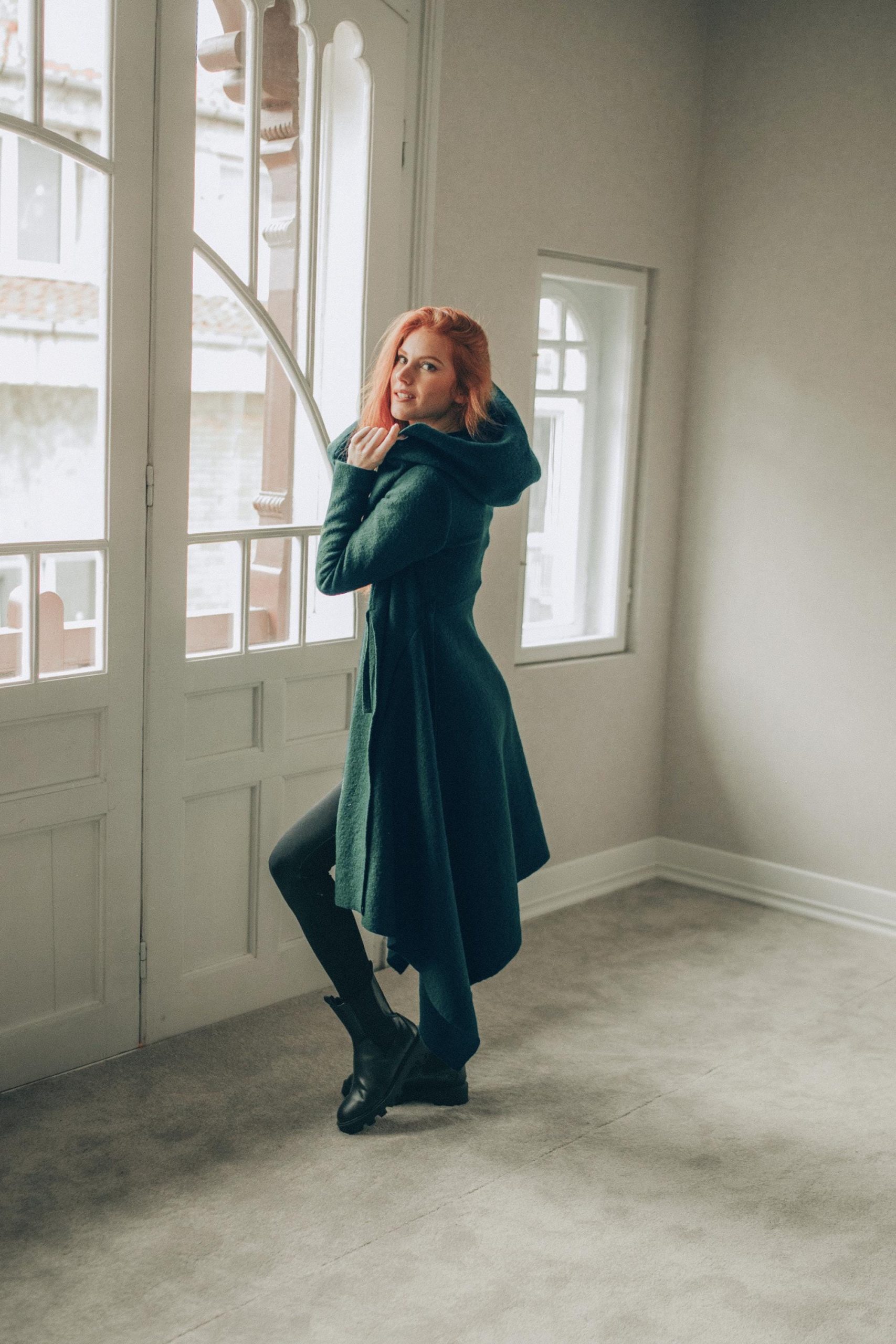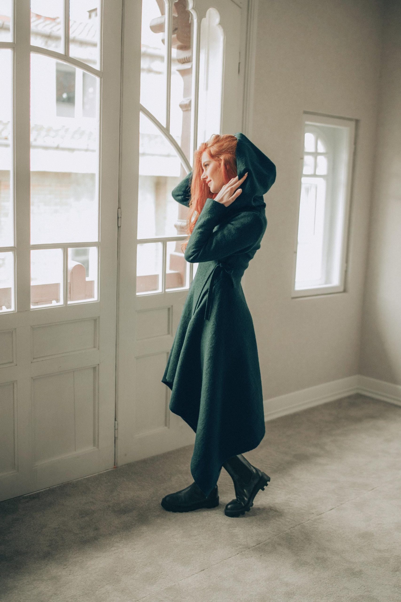 Step into the enchanting world of this emerald green wool cardigan coat, designed to blend cozy comfort with a touch of fantasy. This wool coat features an asymmetric design that flatters every silhouette while offering warmth and style. Crafted with care, the cozy hooded coat invites you to embrace winter with effortless elegance and a unique flair.