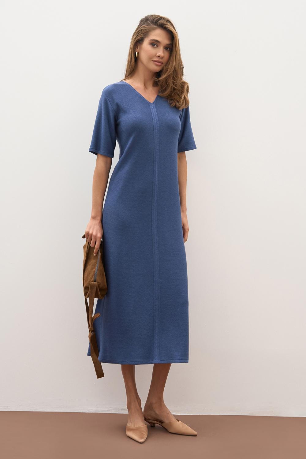 Elegant straight-cut midi dress.