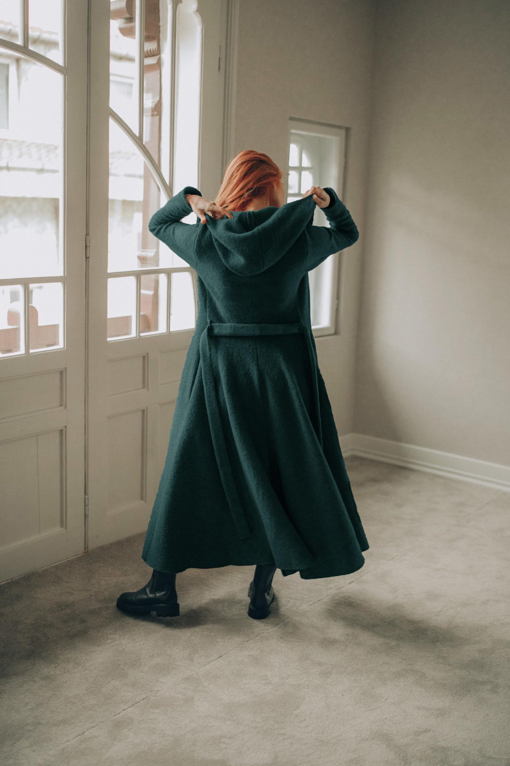 Experience the cozy elegance of this handmade maxi wool cardigan coat, designed to keep you warm and stylish throughout the colder months. Crafted from a soft Merino wool blend, this plus size coat features a flowing princess silhouette, a practical hood, and an adjustable tie belt that flatters every figure. Whether you’re layering for fall or winter, this warm wool cardigan offers both comfort and timeless charm.