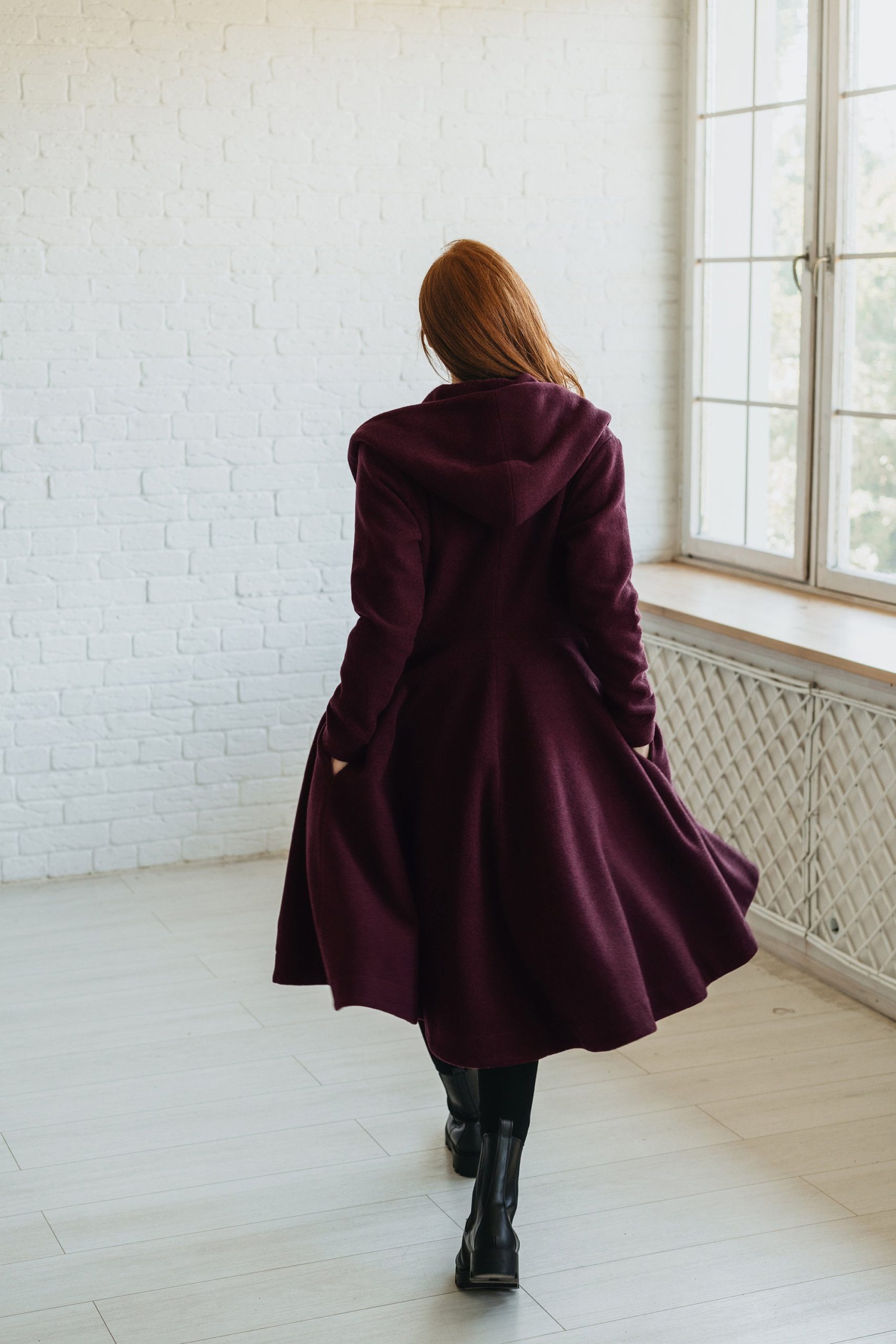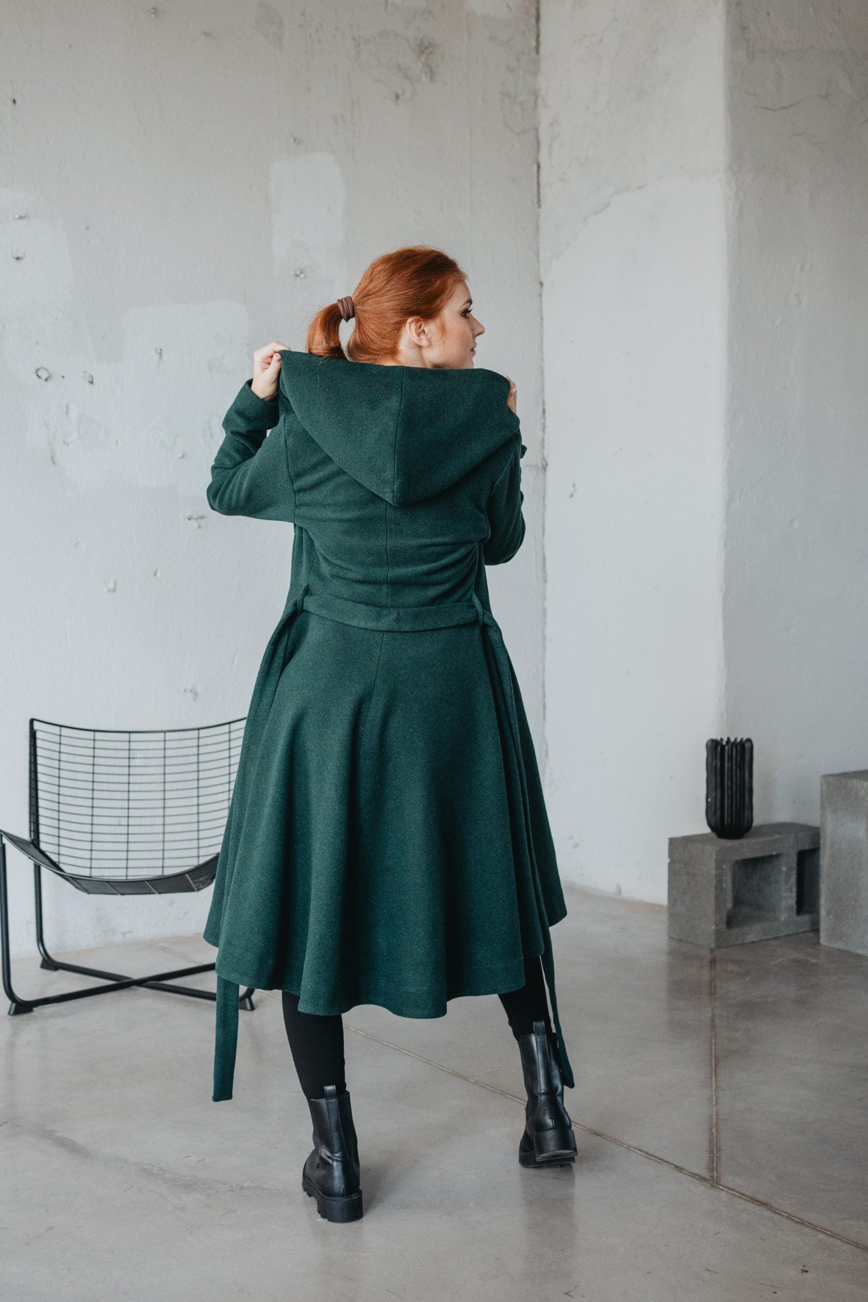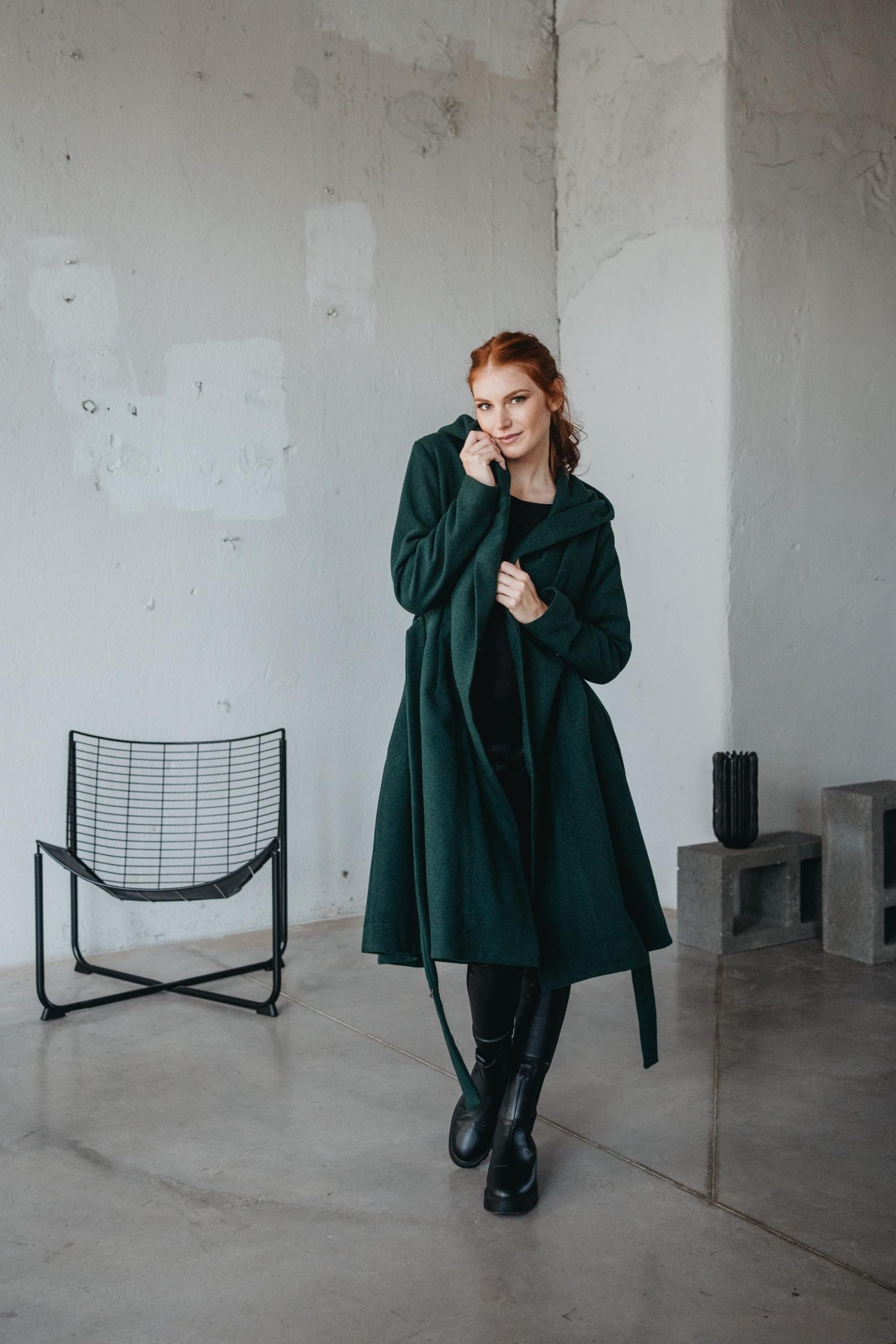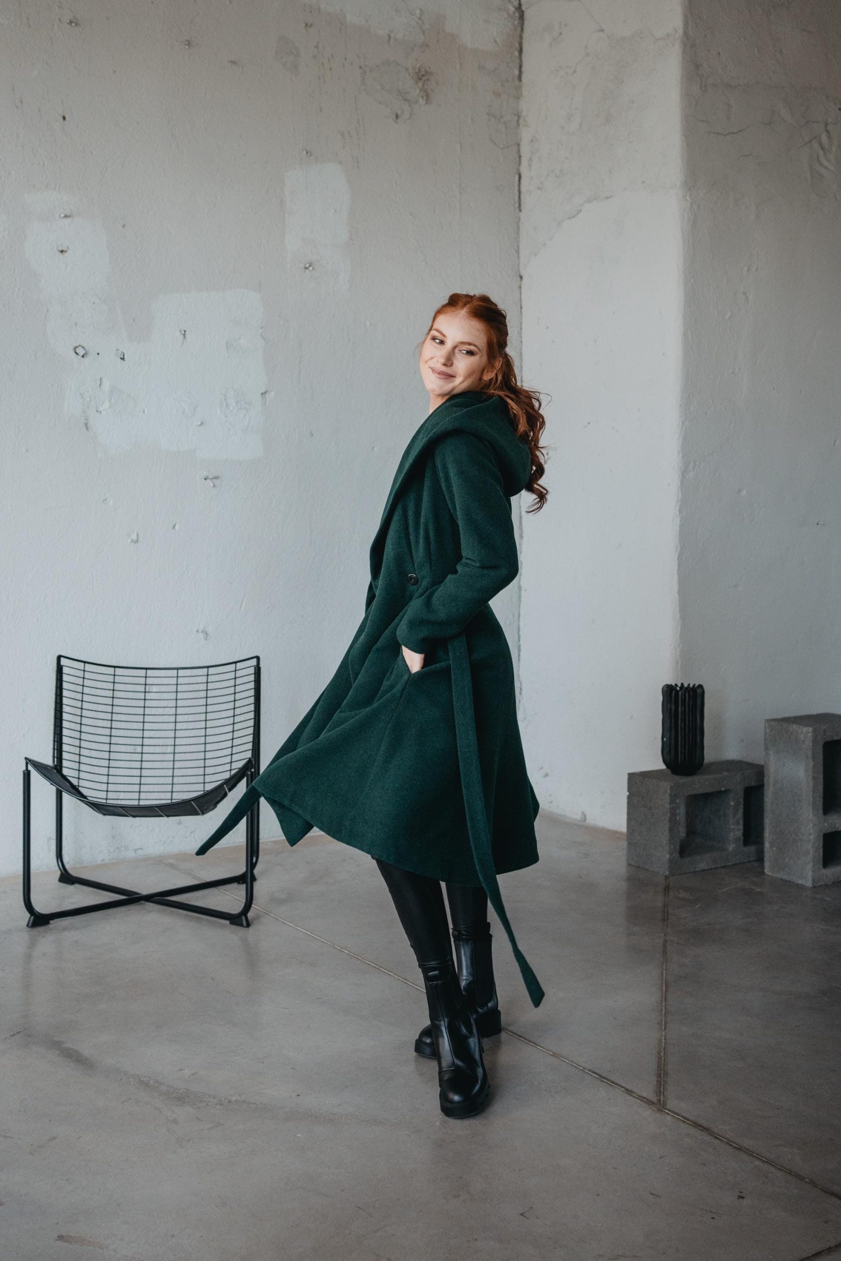 Merino Wool Midi Coat Hooded Princess Style Tie